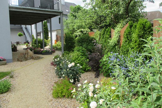 Gestalteter Zufahrtsbereich zum Teil mit Kiesstabilisationsplatten und mediterranen Splitt